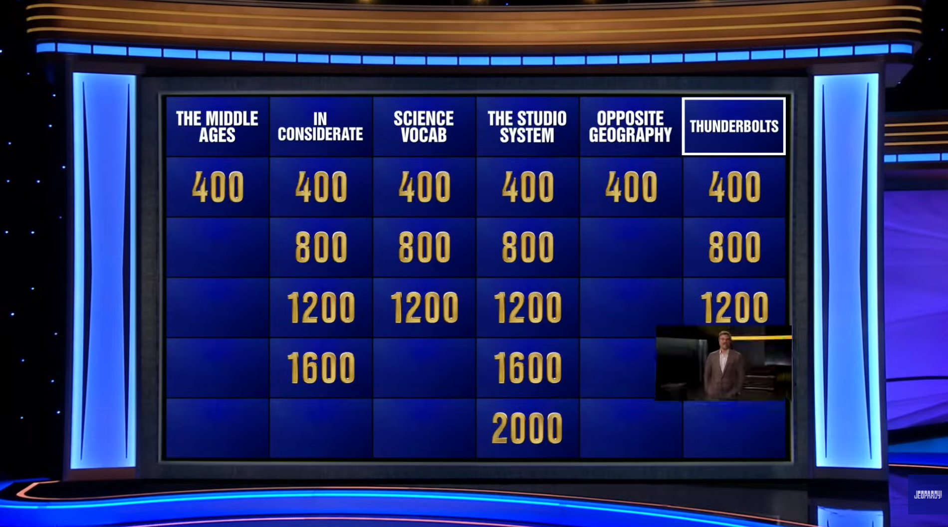 To market the upcoming Thunderbolts* film, we collaborated with ABC and film talent (David Harbour and Florence Pugh) to create a custom "Thunderbolts" category takeover in Jeopardy! Masters.